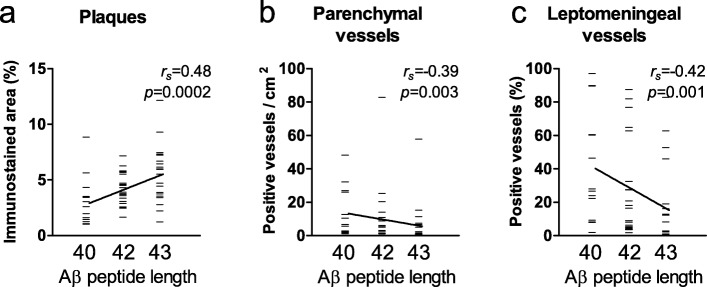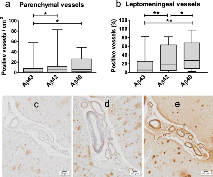 Neuropathological follow-up of patients with Alzheimer's disease (AD) who participated in the first clinical trial of Amyloid-β 42 (Aβ42) immunization (AN1792, Elan Pharmaceuticals) has shown that immunization can induce removal of Aβ42 and Aβ40 from plaques, whereas analysis of the cerebral vessels has shown increased levels of these Aβ peptides in cerebral amyloid angiopathy (CAA). Aβ43 has been less frequently studied in AD, but its aggregation propensity and neurotoxic properties suggest it may have an important pathogenic role. In the current study we show by using immunohistochemistry that in unimmunized AD patients Aβ43 is a frequent constituent of plaques (6.0% immunostained area), similar to Aβ42 (3.9% immunostained area). Aβ43 immunostained area was significantly higher than that of Aβ40 (2.3%, p = 0.006). In addition, we show that Aβ43 is only a minor component of CAA in both parenchymal vessels (1.5 Aβ43-positive vessels per cm2 cortex vs. 5.3 Aβ42-positive vessels, p = 0.03, and 6.2 Aβ40-positive vessels, p = 0.045) and leptomeningeal vessels (5.6% Aβ43-positive vessels vs. 17.3% Aβ42-positive vessels, p = 0.007, and 27.4% Aβ40-positive vessels, p = 0.003). Furthermore, we have shown that Aβ43 is cleared from plaques after Aβ immunotherapy, similar to Aβ42 and Aβ40. Cerebrovascular Aβ43 levels did not change after immunotherapy.