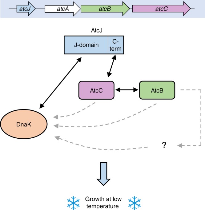 DnaK (Hsp70) is a major ATP-dependent chaperone that functions with two co-chaperones, a J-domain protein (JDP) and a nucleotide exchange factor to maintain proteostasis in most organisms. Here, we show that the environmental bacterium Shewanella oneidensis possesses a previously uncharacterized short JDP, AtcJ, dedicated to cold adaptation and composed of a functional J-domain and a C-terminal extension of 21 amino acids. We showed that atcJ is the first gene of an operon encoding also AtcA, AtcB and AtcC, three proteins of unknown functions. Interestingly, we found that the absence of AtcJ, AtcB or AtcC leads to a dramatically reduced growth at low temperature. In addition, we demonstrated that AtcJ interacts via its C-terminal extension with AtcC, and that AtcC binds to AtcB. Therefore, we identified a previously uncharacterized protein network that involves the DnaK system with a dedicated JDP to allow bacteria to survive to cold environment.