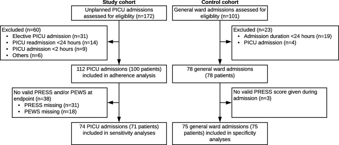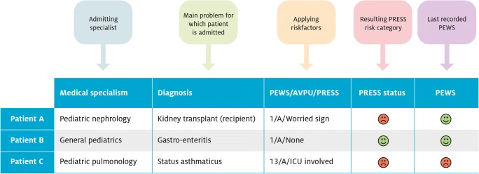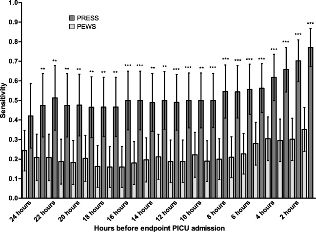 Early recognition of critically ill patients is of paramount importance to reduce pediatric mortality and morbidity. We created a risk stratification system combining vital parameters and predefined risk factors aimed at reducing the risk of unrecognized clinical deterioration compared with conventional Pediatric Early Warning Systems (PEWS). This single-center retrospective case cohort study included infants (gestational age ≥ 37 weeks) to adolescents (aged <18 years) with unplanned pediatric intensive care unit (PICU) admission between April 01, 2014, and February 28, 2018. The sensitivity in the 24 h prior to endpoint of the Pediatric Risk Evaluation and Stratification System (PRESS) was compared with that of the conventional PEWS and calculated as the proportion of study patients who received a high-risk score. Seventy-four PICU admissions were included. PRESS and PEWS sensitivities at 2 h prior to endpoint were 0.70 (95%CI 0.59 to 0.80) and 0.30 (95%CI 0.20 to 0.42) respectively (p < 0.001). Excluding patients with seizures, PRESS sensitivity increased to 0.75 (95%CI 0.64 to 0.85). Forty-nine patients (66%) scored positive on at least one high-risk factor, and "worried sign" was scored in 31 patients (42%).Conclusion: Risk stratification seems advantageous for a faster detection of clinical deterioration, providing opportunity for earlier intervention. What is Known: • Prompt detection of clinical deterioration is of essential importance to reduce morbidity and mortality. • Conventional Pediatric Early Warning Systems (PEWS) have limited sensitivity and a short window of detection of 1 to 2 h. What is New: • Risk stratification based on context factors allows earlier identification of patients at risk, well before deviation of vital signs. • Risk stratification combined with continuous monitoring of deteriorating trends in vital signs could lead to the development of next-generation warning systems achieving true patient safety.