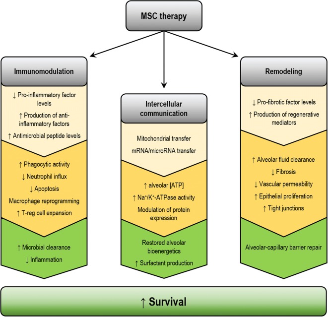 The acute respiratory distress syndrome (ARDS) is a multifaceted lung disorder in which no specific therapeutic intervention is able to effectively improve clinical outcomes. Despite an improved understanding of molecular mechanisms and advances in supportive care strategies, ARDS remains associated with high mortality, and survivors usually face long-term morbidity. In recent years, preclinical studies have provided mounting evidence of the potential of mesenchymal stem cell (MSC)-based therapies in lung diseases and critical illnesses. In several models of ARDS, MSCs have been demonstrated to induce anti-inflammatory and anti-apoptotic effects, improve epithelial and endothelial cell recovery, and enhance microbial and alveolar fluid clearance, thus resulting in improved lung and distal organ function and survival. Early-stage clinical trials have also demonstrated the safety of MSC administration in patients with ARDS, but further, large-scale investigations are required to assess the safety and efficacy profile of these therapies. In this review, we summarize the main mechanisms whereby MSCs have been shown to exert therapeutic effects in experimental ARDS. We also highlight questions that need to be further elucidated and barriers that must be overcome in order to efficiently translate MSC research into clinical practice.