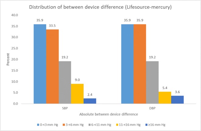 New York City Health and Nutrition Examination Survey (NYC HANES) was a population-based cross-sectional survey of NYC adults conducted twice, in 2004 and again in 2013-2014, to monitor the health of NYC adults 20 years or older. While blood pressure was measured in both surveys, an auscultatory mercury sphygmomanometer was used to measure blood pressure in clinics in 2004, and an oscillometric LifeSource UA-789AC monitor was used in homes in 2013-2014. To assess comparability of blood pressure results across both surveys, we undertook a randomized study comparing blood pressure (BP) readings by the two devices. Blood pressure measuring protocols followed the 2013 Association for the Advancement in Medical instrumentation guidelines for non-invasive blood pressure device. Data from 167 volunteers were analyzed for this purpose.Paired t tests were used to test for significant difference in mean systolic and diastolic blood pressure between devices for overall and by mid-arm circumference categories. To test for systematic differences between the two devices, we generated Bland-Altman graphs. Sensitivity, specificity, and Kappa statistics were calculated to assess between-device agreement for high (≥ 130/80 mmHg) and not high (< 130/80 mmHg) blood pressure, with mercury set as the reference.Systolic and diastolic blood pressure measured by LifeSource UA-789AC were on average 2.0 and 1.1 mmHg higher, respectively, than those of the mercury sphygmomanometer systolic and diastolic blood pressure readings (P < 0.05). Sensitivity was 81%, specificity was 96%, and the Kappa coefficient was 75%. The Bland-Altman graphs showed that the between-device difference did not vary as a function of the average of the two devices for systolic blood pressure and was larger in the lower and upper ends for diastolic blood pressure. Given the observed differences in systolic and diastolic blood pressure readings between the two blood pressure measurement approaches, we calibrated NYC HANES 2013-2014 blood pressure data by predicting mercury blood pressure values from LifeSource blood pressure values. The mean systolic and diastolic blood pressure in NYC HANES 2013-2014 were lower when data were calibrated.