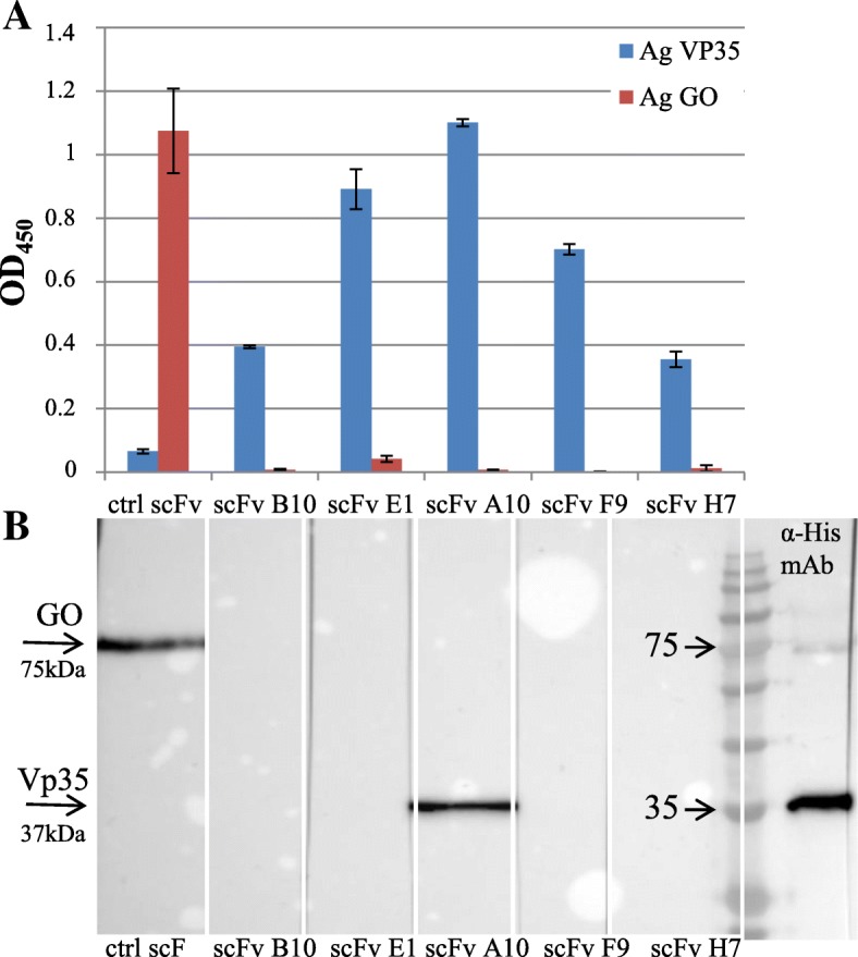 Conclusion: Five antibodies in scFv format recognize an active form of EBOV VP35 in ELISA, while one antibody also recognizes VP35 in WB. Two of these scFvs were also able to interfere with the intracellular activity of VP35 in a cell system in vitro. These findings suggest that such antibodies in scFv format might be employed to develop therapeutic molecules able to hamper EBOV infections.