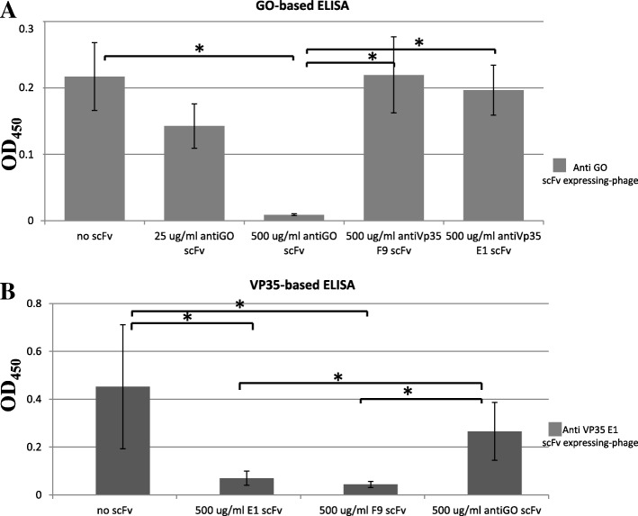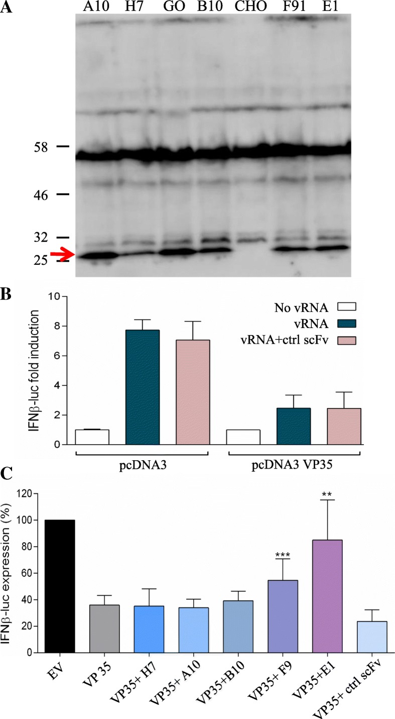 Results: Monoclonal antibodies (mAb) in scFv format specific for the EBOV VP35 were isolated from the ETH-2 library of human recombinant antibodies by phage display technology. Five different clones were identified by sequencing, produced in E.coli and expressed in CHO mammalian cells to be characterized in vitro. All the selected scFvs were able to react with recombinant VP35 protein in ELISA, one of the scFvs being also able to react in Western Blot assay (WB). In addition, all scFvs were expressed in cell cytoplasm as intrabodies; a luciferase reporter gene inhibition assay performed in A549 cells showed that two of the scFvs can significantly hamper the inhibition of the IFN-β-induced RIG-I signaling cascade mediated by EBOV VP35.
