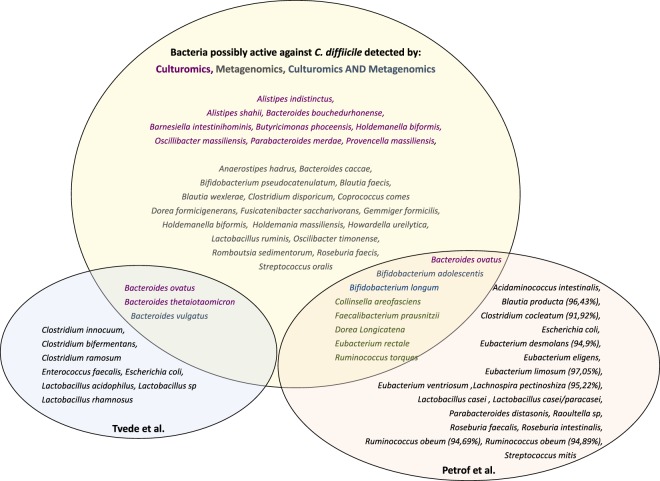 Recently, cocktail of bacteria were proposed in order to treat Clostridium difficile infection (CDI), but these bacteriotherapies were selected more by chance than experimentation. We propose to comprehensively explore the gut microbiota of patients with CDI compared to healthy donors in order to propose a consortium of bacteria for treating C. difficile. We compared stool samples composition from 11 CDI patients and 8 healthy donors using two techniques: metagenomics, 16S V3-V4 region amplification and sequencing and culturomics, high throughout culture using six culture conditions and MALDI-TOF identification. By culturomics, we detected 170 different species in the CDI group and 275 in the control group. Bacteroidetes were significantly underrepresented in the CDI group (p = 0.007). By metagenomics, 452 different operational taxonomic units assigned to the species level were detected in the CDI group compared to 522 in the control group. By these two techniques, we selected 37 bacteria only found in control group in more than 75% of the samples and/or with high relative abundance, 10 of which have already been tested in published bacteriotherapies against CDI, and 3 of which (Bifidobacterium adolescentis, Bifidobacterium longum and Bacteroides ovatus) have been detected by these two techniques. This controlled number of bacteria could be administrated orally in a non-invasive way in order to treat CDI.