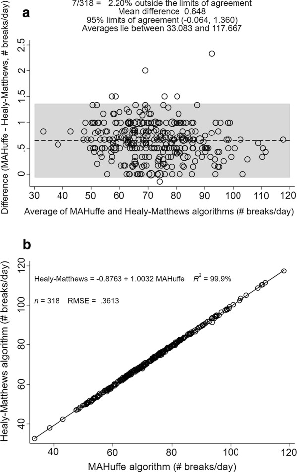 Objectives: To investigate the agreement between two data reduction approaches for detecting sedentary breaks from uni-axial accelerometry data collected in human participants. Free-living, uni-axial accelerometer data (n = 318) were examined for sedentary breaks using two different methods (Healy-Matthews; MAH/UFFE). The data were cleaned and reduced using MAH/UFFE Analyzer software and custom Microsoft Excel macro's, such that the average daily sedentary break number were calculated for each data record, for both methods.