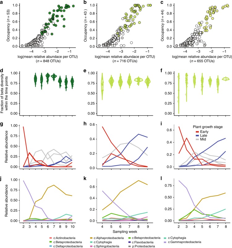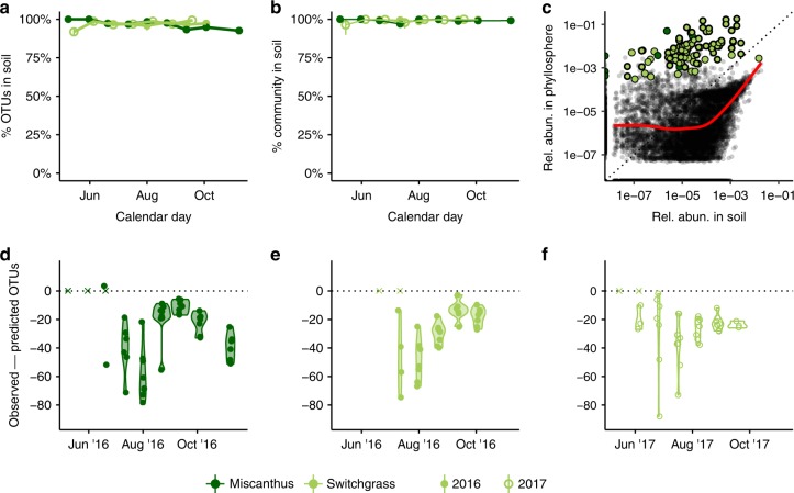 Perennial grasses are promising feedstocks for biofuel production, with potential for leveraging their native microbiomes to increase their productivity and resilience to environmental stress. Here, we characterize the 16S rRNA gene diversity and seasonal assembly of bacterial and archaeal microbiomes of two perennial cellulosic feedstocks, switchgrass (Panicum virgatum L.) and miscanthus (Miscanthus x giganteus). We sample leaves and soil every three weeks from pre-emergence through senescence for two consecutive switchgrass growing seasons and one miscanthus season, and identify core leaf taxa based on occupancy. Virtually all leaf taxa are also detected in soil; source-sink modeling shows non-random, ecological filtering by the leaf, suggesting that soil is an important reservoir of phyllosphere diversity. Core leaf taxa include early, mid, and late season groups that were consistent across years and crops. This consistency in leaf microbiome dynamics and core members is promising for microbiome manipulation or management to support crop production.