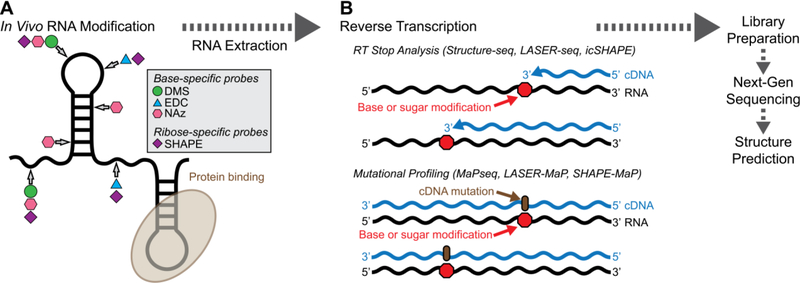 RNA structure underpins many essential functions in biology. New chemical reagents and techniques for probing RNA structure in living cells have emerged in recent years. High-throughput, genome-wide techniques such as Structure-seq2 and DMS-MaPseq exploit nucleobase modification by dimethylsulfate (DMS) to obtain complete structuromes, and are applicable to multiple domains of life and conditions. New reagents such as 1-ethyl-3-(3-dimethylaminopropyl)carbodiimide (EDC), glyoxal, and nicotinoyl azide (NAz) greatly expand the capabilities of nucleobase probing in cells. Additionally, ribose-targeting reagents in selective 2'-hydroxyl acylation and primer extension (SHAPE) detect RNA flexibility in vivo. These techniques, coupled with crosslinking nucleobases in psoralen analysis of RNA interactions and structures (PARIS), provide new and diverse ways to elucidate RNA secondary and tertiary structure in vivo and genome-wide.