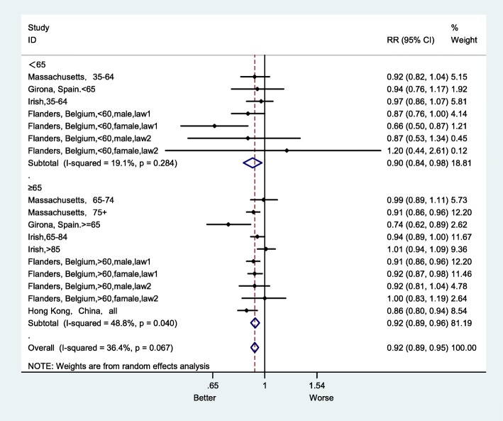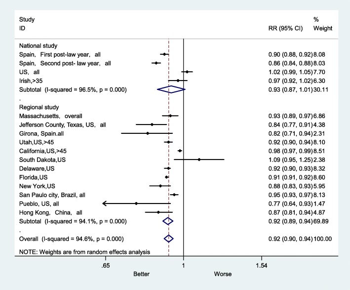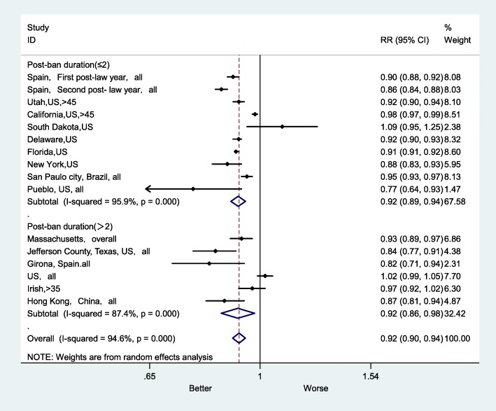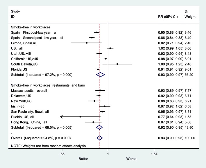 Results: A total of 10 eligible studies with 16 estimates of effect size were included in this meta-analysis. Significant heterogeneity in the risk estimates was identified (overall I2 = 94.6%, p < 0.001). Therefore, a random effects model was utilized to estimate the overall effect of smoke-free legislation. There was an 8% decline in AMI mortality after introducing smoke-free legislation (RR = 0.92, 95% confidence interval (CI): 0.90-0.94). The results of subgroup analyses showed that smoke-free legislation was significantly associated with lower rates of mortality for the following 5 diagnostic subgroups: smoke-free in workplaces, restaurants and bars (RR = 0.92, 95% CI: 0.90-0.95), smaller sample size (RR = 0.92, 95% CI: 0.89-0.95), study location in Europe (RR = 0.90, 95% CI: 0.85-0.94), regional study area (RR = 0.92, 95% CI: 0.89-0.94), and no previous local smoke-free legislation (RR = 0.91, 95% CI: 0.90-0.93). However, there was not much difference in AMI mortality rates after the legislation between the longer (RR = 0.92, 95% CI: 0.86-0.98) and shorter follow-up duration subgroups (RR = 0.92, 95% CI: 0.89-0.94).