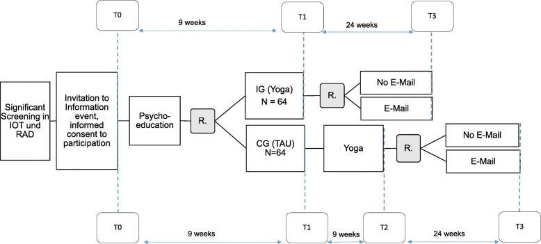 Methods: The aim of the first part of the study will evaluate the effectiveness of yoga for cancer patients with mixed diagnoses reporting fatigue. We will randomly allocate 128 patients to an intervention group (N = 64) receiving yoga and a wait-list control group (N = 64) receiving yoga 9 weeks later. The yoga therapy will be performed in weekly sessions of 60 min each for 8 weeks. The primary outcome will be self-reported fatigue symptoms. In the second part of the study, the effectiveness of reminder e-mails with regard to the exercise frequency and self-reported fatigue symptoms will be evaluated. A randomized allocated group of the participants ("email") receives weekly reminder e-mails, the other group does not. Data will be assessed using questionnaires the beginning and after yoga therapy as well as after 6 months.