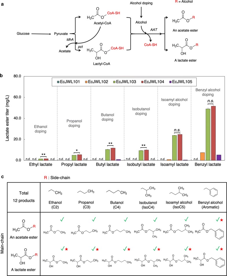 Keywords: Acetate ester; Alcohol acyltransferase; Escherichia coli; Ester; Ethyl lactate; Green solvent; Isobutyl lactate; Lactate ester; Modular cell.