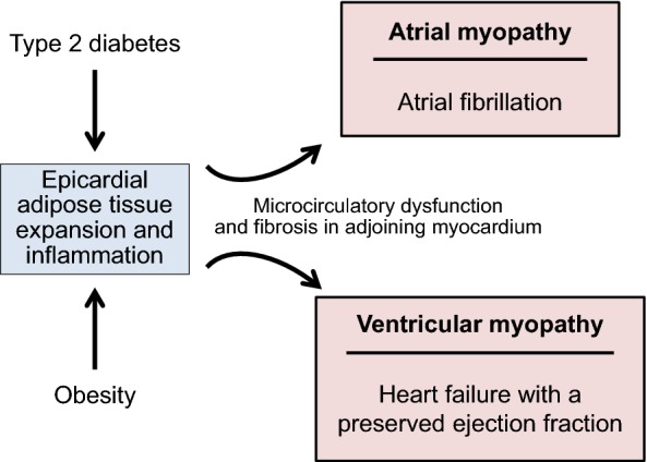 Both obesity and type 2 diabetes are important risk factors for atrial fibrillation (AF), possibly because they both cause an expansion of epicardial adipose tissue, which is the source of proinflammatory adipocytokines that can lead to microvascular dysfunction and fibrosis of the underlying myocardium. If the derangement of epicardial fat adjoins the left atrium, the result is an atrial myopathy, which is clinically manifest as AF. In patients with AF, there is a close relationship between epicardial fat volume and the severity of electrophysiological abnormalities in the adjacent myocardial tissues, and epicardial fat mass predicts AF in the general population. The expansion of epicardial adipose tissue in obesity and type 2 diabetes may also affect the left ventricle, impairing its distensibility and leading to heart failure with a preserved ejection fraction (HFpEF). Patients with obesity or type 2 diabetes with AF often have HFpEF, but the diagnosis may be missed, if dyspnea is attributed to increased body mass or to the arrhythmia. The expected response to the treatment for obesity, diabetes or AF may be influenced by their effects on epicardial inflammation and the underlying atrial and ventricular myopathy. Bariatric surgery and metformin reduce epicardial fat mass and ameliorate AF, whereas insulin promotes adipogenesis and cardiac fibrosis, and its use is accompanied by an increased risk of AF. Rate control strategies for AF may impair exercise tolerance, because they allow for greater time for ventricular filling in patients who cannot tolerate volume loading because of cardiac fibrosis and HFpEF. At the same time, both obesity and diabetes decrease the expected success rate of rhythm control strategies for AF (e.g., electrical cardioversion or catheter ablation), because increased epicardial adipose tissue volumes and cardiac fibrosis are important determinants of AF recurrence following these procedures.