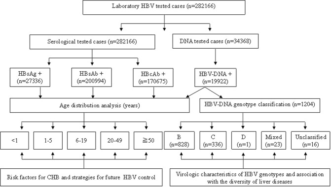 China has nearly 10% of the general HBV carrier population in the world; this infection is the most common cause of chronic liver disease. Understanding HBV epidemiology is essential for future infection control, evaluation, and treatment. This study determined the prevalence of HBV infection in Shenzhen by serological testing and analysis in 282,166 HBV screening cases for the following: HBcAb, indicative of previous HBV infection; HBsAg, indicative of chronic (current) infection; HBsAb, indicative of immunity from vaccination; and 34,368 HBV etiological screening cases for HBV-DNA, indicative of virus carriage, in which 1,204 cases were genotyped and mutation analyzed for drug-resistance evaluation. Shenzhen was a highly endemic area of HBV throughout the study period (prevalence 9.69%). HBV infections were almost entirely in the 20 and older age groups with a male-to-female ratio of 1.16:1 which is approximately the same as the male-to-female ratio of the general population in China. However, only 71.25% of the general population retained HBV immune protection. Genotype B and C were identified as the most common agents; recombinant B/C and B/D also existed; some cases, however, could not be genotyped. NAs resistant mutation occurrence patterns were multitudinous; single mutation patterns of rtM204I/V and rtL180M occurrences accounted for majority, followed by the combinational mutation pattern L180M + M204I/V. Drug-resistance was prevalent, mainly occurring in the cross resistance patterns LAM + LdT and LAM + LdT + ETV, and significantly more critical in males. These results demonstrate that all people free from HBV infection should obtain injections of the vaccine or booster shots, and conventional virologic detection in a clinical laboratory center should incorporate genotype and mutation alongside the serological factors for etiology and develop better classification methods, such as sequencing.