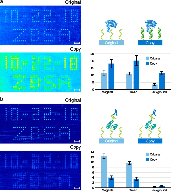Analogous to a photocopier, we developed a DNA microarray copy technique and were able to copy patterned original DNA microarrays. With this process the appearance of the copied DNA microarray can also be altered compared to the original by producing copies of different resolutions. As a homage to the very first photocopy made by Chester Charlson and Otto Kornei, we performed a lookalike DNA microarray copy exactly 80 years later. Those copies were also used for label-free real-time kinetic binding assays of apo-dCas9 to double stranded DNA and of thrombin to single stranded DNA. Since each DNA microarray copy was made with only 5 µl of spPCR mix, the whole process is cost-efficient. Hence, our DNA microarray copier has a great potential for becoming a standard lab tool.