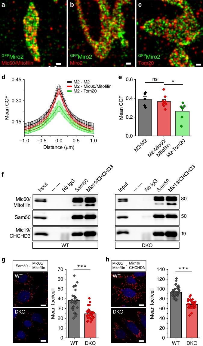 Mitochondrial Rho (Miro) GTPases localize to the outer mitochondrial membrane and are essential machinery for the regulated trafficking of mitochondria to defined subcellular locations. However, their sub-mitochondrial localization and relationship with other critical mitochondrial complexes remains poorly understood. Here, using super-resolution fluorescence microscopy, we report that Miro proteins form nanometer-sized clusters along the mitochondrial outer membrane in association with the Mitochondrial Contact Site and Cristae Organizing System (MICOS). Using knockout mouse embryonic fibroblasts we show that Miro1 and Miro2 are required for normal mitochondrial cristae architecture and Endoplasmic Reticulum-Mitochondria Contacts Sites (ERMCS). Further, we show that Miro couples MICOS to TRAK motor protein adaptors to ensure the concerted transport of the two mitochondrial membranes and the correct distribution of cristae on the mitochondrial membrane. The Miro nanoscale organization, association with MICOS complex and regulation of ERMCS reveal new levels of control of the Miro GTPases on mitochondrial functionality.