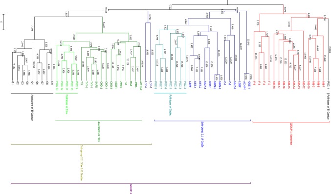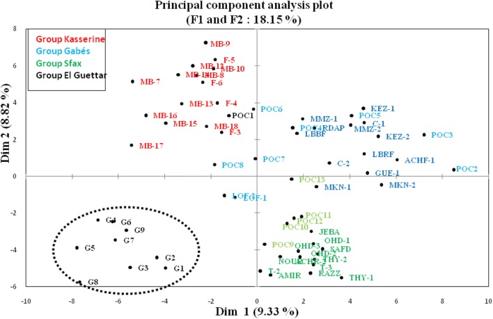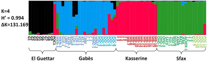 Pistachio trees (Pistacia vera L.) have been cultivated in Tunisia for decades and the plantation was extended mostly in the center of the country contributing to the economic growth of marginalized areas. Herein we used conserved DNA derived polymorphism (CDDP) technique, which target specifically conserved sequences of plant functional genes, to assess the genetic diversity and construct genetic relationships among 65 Tunisian pistachio trees. A set of nine primers were used and 157 CDDP markers were revealed with an average of 17.44 showing a high degree of polymorphism (99.37%). The average of polymorphism information content of CDDP markers was of 0.86, which indicates the efficiency of CDDP primers in the estimation of genetic diversity between pistachios. UPGMA dendrogram and the principal component analysis showed four clusters of analyzed pistachios trees. Our results showed that the genetic structure depends on: (1) the gene exchanges between groups, (2) the geographical origin and (3) the sex of the tree. The same result was revealed by the Bayesian analysis implemented in STRUCTURE at K = 4, in which the pistachio genotypes of El Guettar, Kasserine and Sfax were assigned with more than 80% of probability. Our results prove polymorphism and efficiency of CDDP markers in the characterization and genetic diversity analysis of P. vera L. genotypes to define conservation strategy.