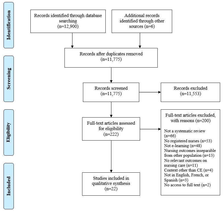 Methods: We conducted a systematic review of systematic qualitative, quantitative, and mixed-studies reviews, searching within four bibliographic databases. The eligibility criteria were formulated using the population, interventions, comparisons, outcomes, and study design (PICOS) format. The included population was registered nurses. E-learning interventions were included and compared with face-to-face and any other e-learning interventions, as well as blended learning. The outcomes of interest were derived from two models: nursing-sensitive indicators from the Nursing Care Performance Framework (eg, teaching and collaboration) and the levels of evaluation from the Kirkpatrick model (ie, reaction, learning, behavior, and results).