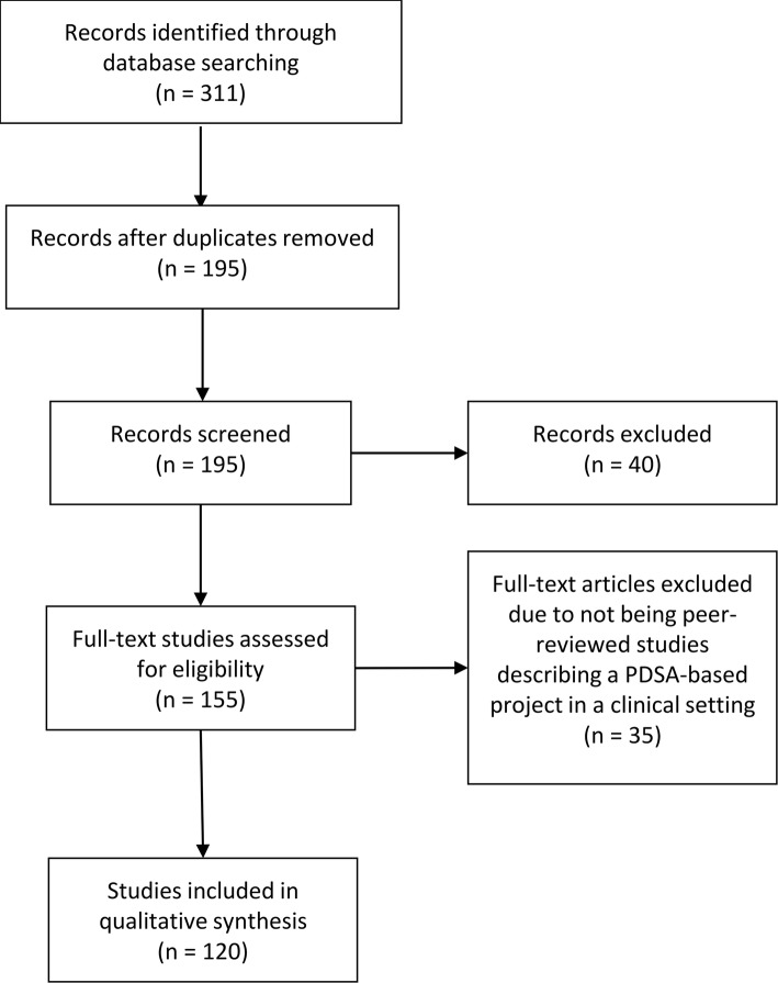 Methods: A systematic literature search was performed in the PubMed, Embase and CINAHL databases. QI projects using PDSA published in peer-reviewed journals in 2015 and 2016 were included. Projects were assessed to determine the reported effects and the use of the following key methodological features; iterative cyclic method, continuous data collection, small-scale testing and use of a theoretical rationale.