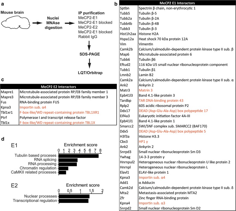 Background: MeCP2-a chromatin-binding protein associated with Rett syndrome-has two main isoforms, MeCP2-E1 and MeCP2-E2, differing in a few N-terminal amino acid residues. Previous studies have shown brain region-specific expression of these isoforms which, in addition to their different cellular localization and differential expression during brain development, suggest that they may also have non-overlapping molecular mechanisms. However, differential functions of MeCP2-E1 and E2 remain largely unexplored.