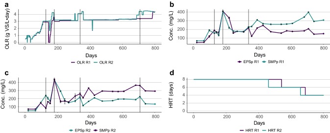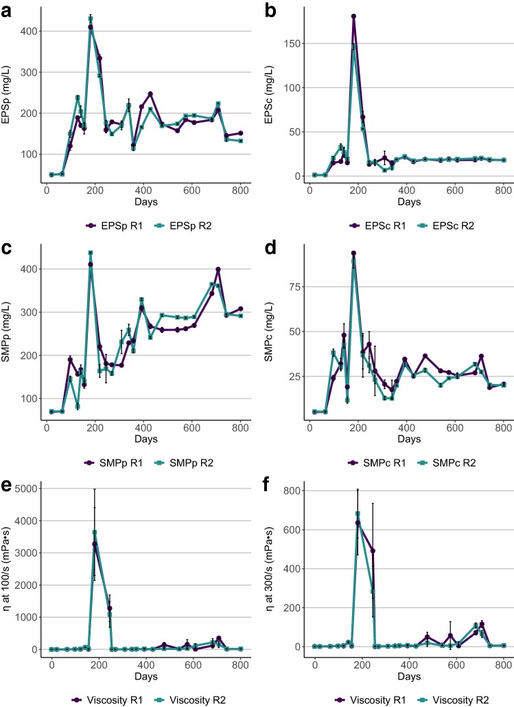 The production processes of the pulp and paper industry often run in campaigns, leading to large variations in the composition of wastewaters and waste sludges. During anaerobic digestion (AD) of these wastes, the viscosity or the production of extracellular polymeric substances (EPS) and soluble microbial products (SMP) may be affected, with the risk of foam formation, inefficient digester mixing or poor sludge dewaterability. The aim of this study was to investigate how viscosity and production of EPS and SMP during long-term AD of pulp and paper mill sludge is affected by changes in organic loading rate (OLR) and hydraulic retention time (HRT). Two mesophilic lab-scale continuous stirred tank reactors (CSTRs) were operated for 800 days (R1 and R2), initially digesting only fibre sludge, then co-digesting fibre sludge and activated sludge. The HRT was lowered, followed by an increase in the OLR. Reactor fluids were sampled once a month for rheological characterization and analysis of EPS and SMP. The production of the protein fraction of SMP was positively correlated to the OLR, implicating reduced effluent qualities at high OLR. EPS formation correlated with the magnesium content, and during sulphate deficiency, the production of EPS and SMP increased. At high levels of EPS and SMP, there was an increase in viscosity of the anaerobic sludges, and dewatering efficiency was reduced. In addition, increased viscosity and/or the production of EPS and SMP were important factors in sludge bulking and foam formation in the CSTRs. Sludge bulking was avoided by more frequent stirring.