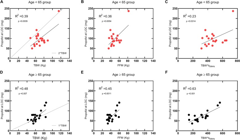 Results: Forty patients were enrolled in the study. Total propofol dose required to LOC was lower in Age ≥ 65 group and a higher plasma propofol concentration was measured in this group. 60% of old patients were classified as "apparently vulnerable" or "frail" and narrow phase angle values were associated with increasing vulnerability scores. In the Age ≥ 65 group, the correlation analysis showed that the relationship between propofol dose and total body weight (TBW) scaled by the corresponding phase angle value is stronger than the correlation between propofol dose and TBW or fat free mass (FFM).