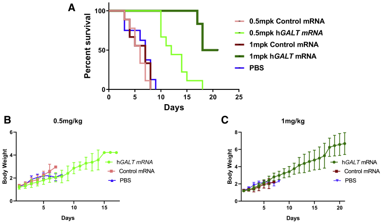 Classic galactosemia (CG) is a potentially lethal inborn error of galactose metabolism that results from deleterious mutations in the human galactose-1 phosphate uridylyltransferase (GALT) gene. Previously, we constructed a GalT-/- (GalT-deficient) mouse model that exhibits galactose sensitivity in the newborn mutant pups, reduced fertility in adult females, impaired motor functions, and growth restriction in both sexes. In this study, we tested whether restoration of hepatic GALT activity alone could decrease galactose-1 phosphate (gal-1P) and plasma galactose in the mouse model. The administration of different doses of mouse GalT (mGalT) mRNA resulted in a dose-dependent increase in mGalT protein expression and enzyme activity in the liver of GalT-deficient mice. Single intravenous (i.v.) dose of human GALT (hGALT) mRNA decreased gal-1P in mutant mouse liver and red blood cells (RBCs) within 24 h with low levels maintained for over a week. Repeated i.v. injections increased hepatic GalT expression, nearly normalized gal-1P levels in liver, and decreased gal-1P levels in RBCs and peripheral tissues throughout all doses. Moreover, repeated dosing reduced plasma galactose by 60% or more throughout all four doses. Additionally, a single intraperitoneal dose of hGALT mRNA overcame the galactose sensitivity and promoted the growth in a GalT-/- newborn pup.
