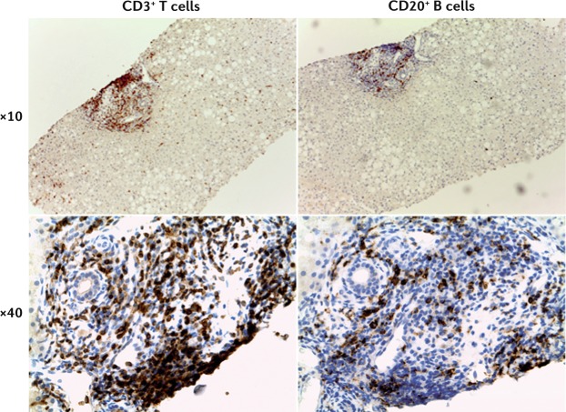 In the past decade, nonalcoholic fatty liver disease (NAFLD) has become a leading cause of chronic liver disease and cirrhosis, as well as an important risk factor for hepatocellular carcinoma (HCC). NAFLD encompasses a spectrum of liver lesions, including simple steatosis, steatohepatitis and fibrosis. Although steatosis is often harmless, the lobular inflammation that characterizes nonalcoholic steatohepatitis (NASH) is considered a driving force in the progression of NAFLD. The current view is that innate immune mechanisms represent a key element in supporting hepatic inflammation in NASH. However, increasing evidence points to the role of adaptive immunity as an additional factor promoting liver inflammation. This Review discusses data regarding the role of B cells and T cells in sustaining the progression of NASH to fibrosis and HCC, along with the findings that antigens originating from oxidative stress act as a trigger for immune responses. We also highlight the mechanisms affecting liver immune tolerance in the setting of steatohepatitis that favour lymphocyte activation. Finally, we analyse emerging evidence concerning the possible application of immune modulating treatments in NASH therapy.