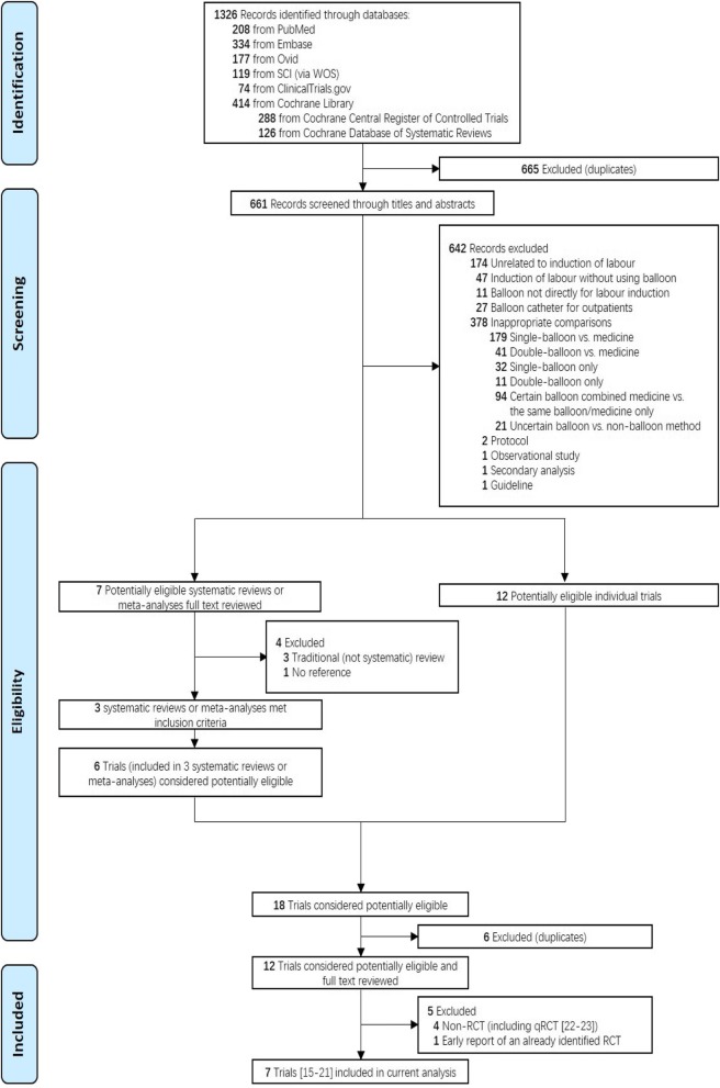 Methods: Using the population, intervention, comparison, outcomes and study designs (PICOS) principle, we searched the PubMed, EMBASE, OVID, SCI, CENTRAL, ClinicalTrial.gov , and CDSR databases to identify relevant randomised controlled trials (RCTs) from inception through February 14, 2018. The primary outcome was the caesarean delivery rate, and the secondary outcomes focused on efficacy, efficiency, safety, and patient satisfaction. The relative risks or mean differences, including their 95% confidence intervals, were calculated using fixed-effects or random-effects models. All statistical analyses were completed with RevMan version 5.3.