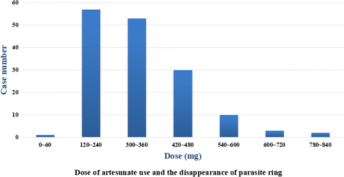 Conclusions: Five mutations of the k13-propeller gene in 319 P. falciparum samples from patients returning from Africa were identified. The frequency of the k13-propeller mutants was low, and the mutations were not strongly associated with artemisinin resistance. The median (IQR) dose of artesunate monotherapy in actual clinical treatment to remove asexual parasite stages was 407.55 (360-510) mg, equivalent to D3-D4. Some P. falciparum cases without a k13-propeller mutation showed obvious delayed clearance of the parasite from peripheral blood. Trial registration The diagnosis of malaria and the treatment of malaria-infected patients are the routine work of Centres for Disease Control and Prevention. Information on the patients was conveyed with the patient's approval, and the research aim, methods, risks and benefits of the study were explained in detail to the patients.