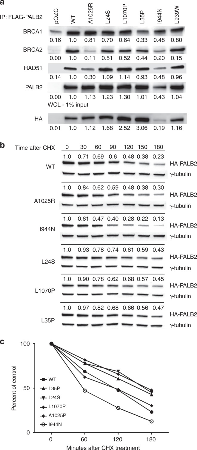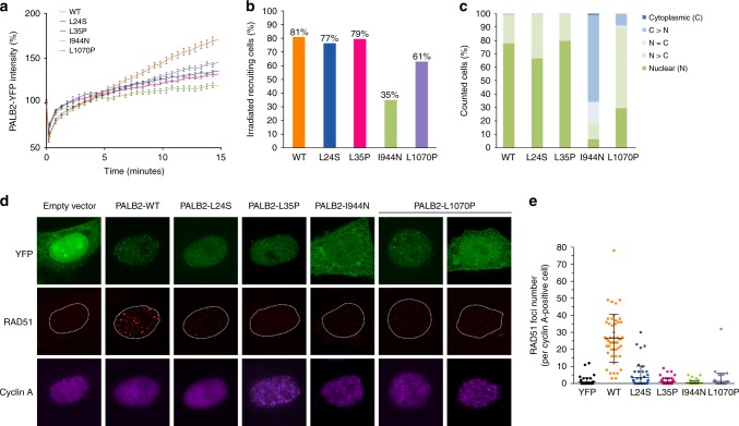 Results: Four (~5%) variants (p.L24S,c.71T>C; p.L35P,c.104T>C; pI944N,c.2831T>A; and p.L1070P,c.3209T>C) disrupted PALB2-mediated HDR activity. These variants conferred sensitivity to cisplatin and a poly(ADP-ribose) polymerase (PARP) inhibitor and reduced RAD51 foci formation in response to DNA damage. The p.L24S and p.L35P variants disrupted BRCA1-PALB2 protein complexes, p.I944N was associated with protein instability, and both p.I944N and p.L1070P mislocalized PALB2 to the cytoplasm.