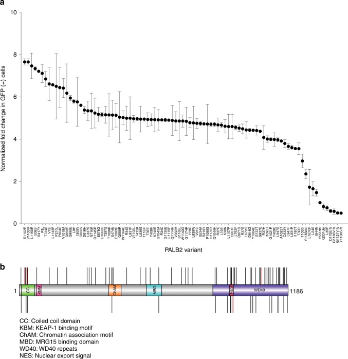 Methods: The influence of 84 VUS on PALB2 function was evaluated using a cellular homology directed DNA repair (HDR) assay and VUS impacting activity were further characterized using secondary functional assays.