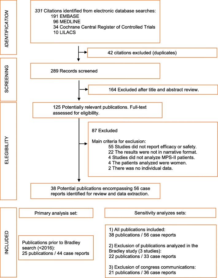 Methods: A systematic review and meta-analysis of case reports published by April 2018 was conducted for MPS-II patients treated with enzyme replacement therapy (ERT). The study is reported in accordance with PRISMA and MOOSE guidelines (PROSPERO database code CRD42018093408). The assessed population and outcomes were the same as previously analyzed in a meta-analysis of MPS-II clinical studies. The primary endpoint was the percent of clinical cases showing improvement in efficacy outcome, or no harm in safety outcome after ERT initiation. A restrictive procedure to aggregate case reports, by selecting standardized and well-defined outcomes, was proposed. Different sensitivity analyses were able to evaluate the robustness of results.