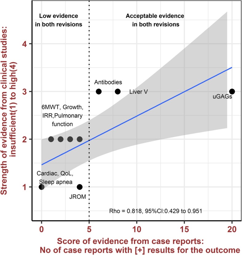 Results: Every outcome classified as "acceptable evidence group" in our case report meta-analysis had been graded as "moderate strength of evidence" in the aforementioned meta-analysis of clinical studies. Sensitivity, specificity, and positive-negative predictive values for results of both meta-analyses reached 100%, and were deemed equivalent.