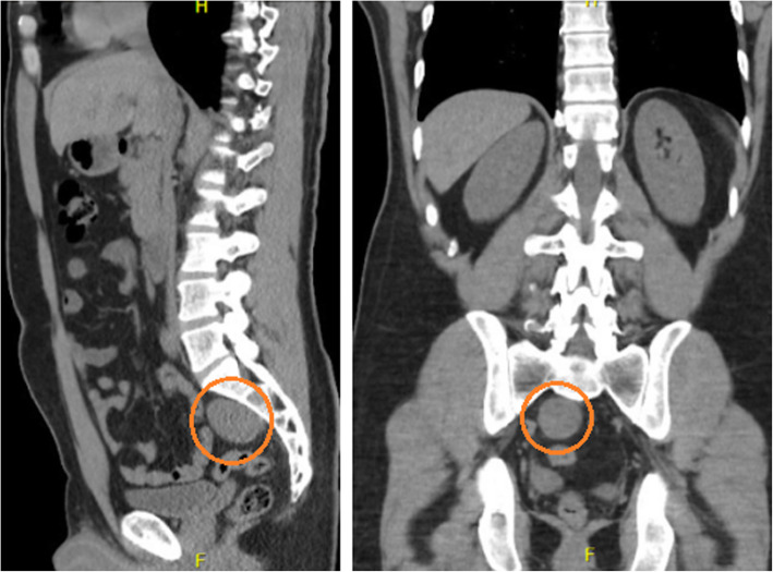 Case presentation: This is a case report of a male patient, 41 years old, with symptoms of hipogastric and lower right member pain, as well as a history of a papilliferous thyroid tumor. Computerized tomography exams were inconclusive, showing a mass in the presacral region with dimensions of 4.4 × 3.9 × 3.4 cm. Removal was carried out by laparoscopic surgery, with self-limited postoperative complications. Diagnosis was carried out by anatomopathological examination, and syndromic hypotheses were discarded.