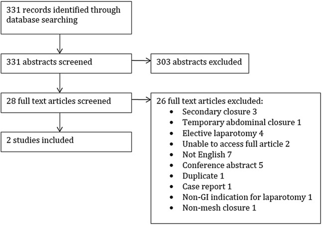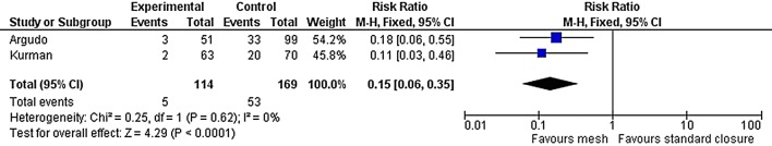 Results: 332 studies were screened for eligibility, 29 full texts were reviewed and 2 non-randomised studies were included. Both studies were biased due to confounding factors, as closure technique was based on patient risk factors for incisional hernia. Both studies found significantly fewer incisional hernias in the mesh groups [3.2% vs 28.6% (p < 0.001) and 5.9% vs 33.3% (p = 0.0001)]. A meta-analysis of incisional hernia risk favoured prophylactic mesh closure [risk ratio 0.15 (95% CI 0.6-0.35, p < 0.001)]. Neither study found an association between mesh and infection or enterocutaneous fistula.