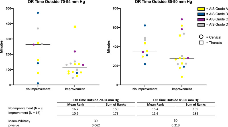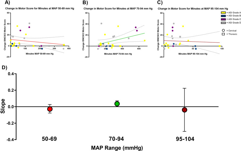 Results: An exploratory analysis revealed that increased time within an intraoperative MAP range (70-94 mmHg) was associated with ISNCSCI motor score improvement. A significant regression equation was found for the MAP range 70-94 mmHg (F[1, 23] = 5.07, r2 = 0.181, p = 0.034). ISNCSCI motor scores increased 0.039 for each minute of exposure to the MAP range 70-94 mmHg during the operative procedure; this represents a significant correlation between intraoperative time with MAP 70-94 and subsequent motor recovery. Blood pressure exposures above or below this range did not display a positive association with motor recovery.