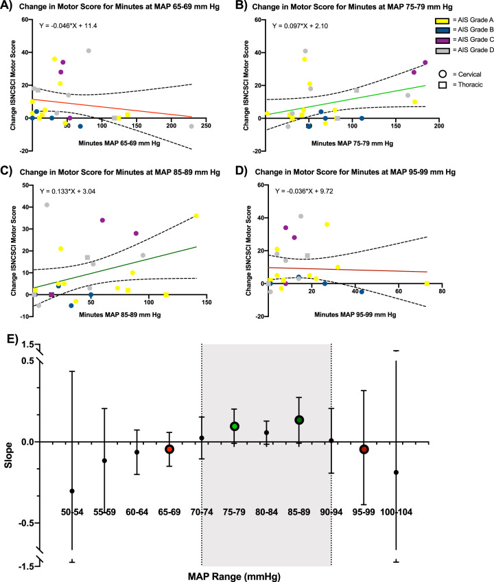 Methods: Twenty-five individuals with traumatic SCI who received surgical and acute rehabilitation care at a level-one trauma center were included in this study. The Surgical Information System captured intraoperative MAPs on a minute-by-minute basis and exposure was quantified at sequential thresholds from 50 to 104 mmHg. Change in International Standards for Neurological Classification of Spinal Cord Injury (ISNCSCI) motor score was calculated based on physiatry evaluations at the earliest postoperative time and at discharge from acute rehabilitation. Linear regression models were used to estimate the rate of recovery across the entire MAP range.