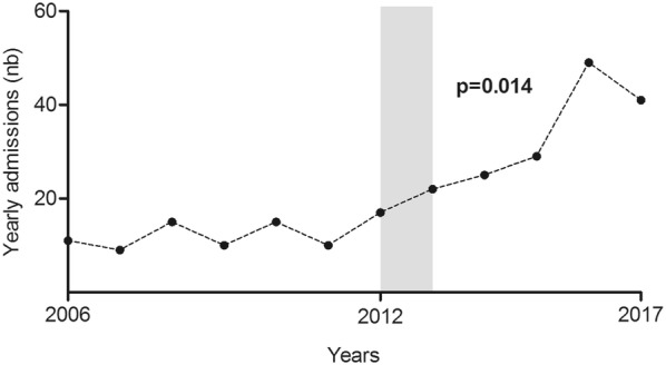 Results: Overall, 224 patients were admitted: 60 before, 35 during, and 129 after bundle implementation. Admission after implementation was associated with increased yearly admissions (10 [8-13] vs 30 [24-43] patients/year, p = 0.014) and decreased mortality (30 vs 15%, HR = 0.49 [0.26-0.92]; p = 0.026) but was no longer a protective factor for mortality after adjustment on confounding factors (adjusted HR = 0.90 [0.43-1.88], p = 0.780). There was no significant difference regarding time to surgery (0 [0-1] vs 0 [0-1] days, p = 0.192) or rate of antibiotic treatment within 24 h (98% vs 99%, p > 0.99).