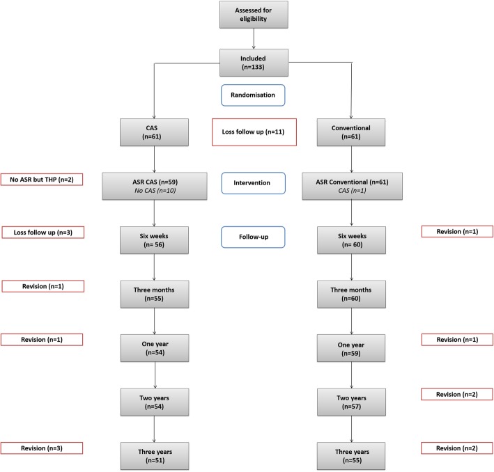 Results: A total of 122 patients were randomized, 61 in the CAS group and 61 in the conventional group. There was no significant differences in accuracy of femoral implant position. The mean difference between the postoperative- and preplanned SSA was - 2.26 and - 1.75 degrees (more varus) respectively in the CAS and Conventional group. After surgery both groups show significant improvement in all PROMs compared to the baseline measurements, with no significant differences between the groups.