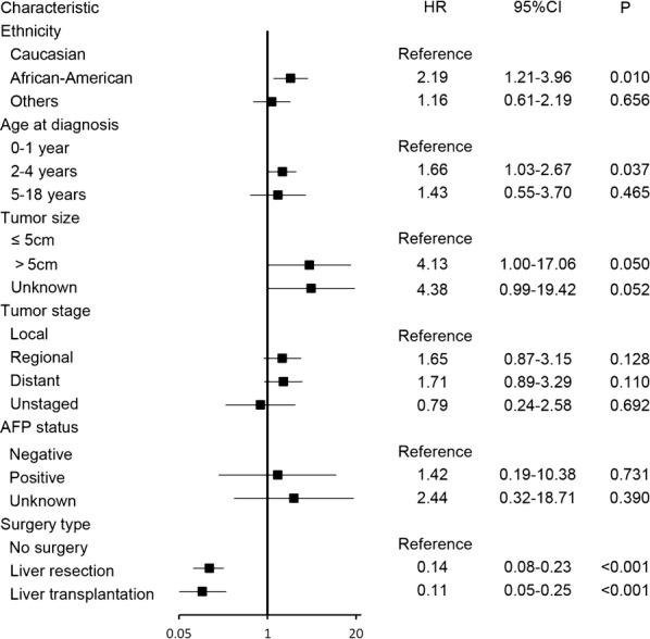 Results: Between 2004 and 2015, hepatoblastoma incidence increased significantly (APC, 2.2%; 95% confidence interval [CI] 0.5% to 3.8%, P < 0.05). In particular, this increase was observed among 2- to 4-year-old patients, males, and African-Americans. The 5- and 10-year OS rates were 81.5% and 81.0%, respectively. Age of 2 to 4 years, African-American ethnicity, and no surgery were independent predictors for short OS. Distant disease at presentation was found not to be an independent factor of survival. The nomogram had a C-index of 0.79 (95% CI 0.74-0.84) with appropriate calibration curve fitting.