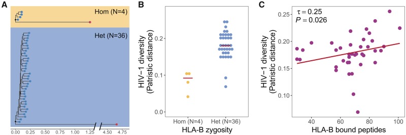 Pathogen-mediated balancing selection is regarded as a key driver of host immunogenetic diversity. A hallmark for balancing selection in humans is the heterozygote advantage at genes of the human leukocyte antigen (HLA), resulting in improved HIV-1 control. However, the actual mechanism of the observed heterozygote advantage is still elusive. HLA heterozygotes may present a broader array of antigenic viral peptides to immune cells, possibly resulting in a more efficient cytotoxic T-cell response. Alternatively, heterozygosity may simply increase the chance to carry the most protective HLA alleles, as individual HLA alleles are known to differ substantially in their association with HIV-1 control. Here, we used data from 6,311 HIV-1-infected individuals to explore the relative contribution of quantitative and qualitative aspects of peptide presentation in HLA heterozygote advantage against HIV. Screening the entire HIV-1 proteome, we observed that heterozygous individuals exhibited a broader array of HIV-1 peptides presented by their HLA class I alleles. In addition, viral load was negatively correlated with the breadth of the HIV-1 peptide repertoire bound by an individual's HLA variants, particularly at HLA-B. This suggests that heterozygote advantage at HLA-B is at least in part mediated by quantitative peptide presentation. We also observed higher HIV-1 sequence diversity among HLA-B heterozygous individuals, suggesting stronger evolutionary pressure from HLA heterozygosity. However, HLA heterozygotes were also more likely to carry certain HLA alleles, including the highly protective HLA-B*57:01 variant, indicating that HLA heterozygote advantage ultimately results from a combination of quantitative and qualitative effects in antigen presentation.