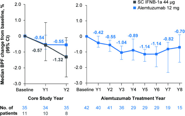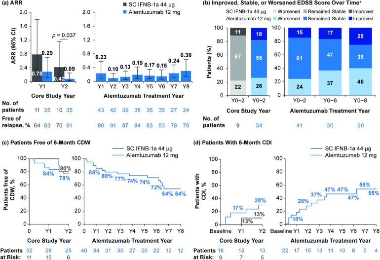 Results: Of 1200 CARE-MS patients, 43 (4%) were of African descent (35 IAT; 8 DAT) and received alemtuzumab in the 2-year core and/or 6-year extension; 29 (67%) remained on study at the time of analysis (24 IAT patients completed year 8 post alemtuzumab; 5 DAT patients completed year 6 post alemtuzumab). In year 2, annualized relapse rate (ARR; 0.09 versus 0.42), percentage of patients with improved Expanded Disability Status Scale (EDSS; 18% versus 11%), 6-month confirmed disability improvement (CDI; 28% versus 13%), no evidence of disease activity (55% versus 13%), and cumulative brain volume loss (BVL; - 0.55% versus - 1.32%) favored alemtuzumab versus SC IFNB-1a. Alemtuzumab remained efficacious at year 6 (pooled IAT/DAT) and at year 8 (IAT only) post alemtuzumab (ARR: 0.15 and 0.30; improved EDSS: 17% and 25%; CDI: 47% and 55%; BVL: - 1.14% and - 0.70%, respectively). No safety signals were unique to this population.