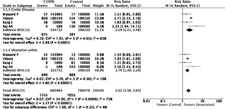 Results: Four studies including a pooled population of 1355 new cases were included. We found association between new onset IBD in COPD population. The risk of bias was low in most of them. Only one study reported tobacco exposure as a potential confounding factor. The pooled risk ratio (RR) for a new diagnosis of IBD in COPD patients was 2.02 (CI, 1.56 to 2.63), I2 = 72% (GRADE: low). The subgroup analyses for Crohn's disease and ulcerative colitis yielded RRs of 2.29 (CI, 1.51 to 3.48; I2 = 62%), and 1.79 (CI, 1.39 to 2.29; I2 = 19%.), respectively.