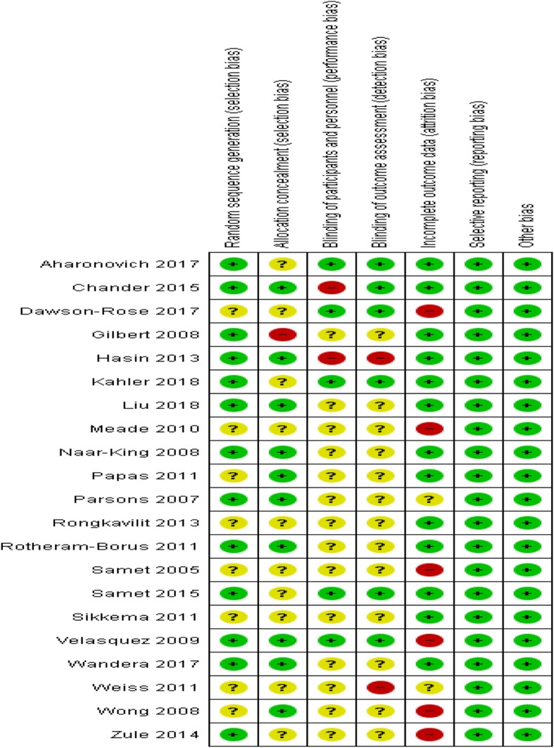 Methods: A search was conducted in the following databases: PubMed, Cochrane Central Register of Trials (CENTRAL), MEDLINE (Ovid), EMBASE, PsychInfo (Ovid) and Clinical trials.gov (clinicaltrials.gov) for eligible studies until August 2018 for psychotherapy and psychosocial interventions for PLWH with AUDs. Two reviewers independently screened titles, abstracts and full texts to select studies that met the inclusion criteria. Two reviewers independently performed data extraction with any differences resolved through discussion. Risk of bias was assessed by two independent reviewers using the Cochrane risk of bias tool, and the concordance between the first and second reviewers was 0.63 and between the first and third reviewers 0.71. Inclusion criteria were randomised controlled trials using psychological interventions in people aged 16 and above, with comparisons being usual care, enhanced usual care, other active treatments or waitlist controls.