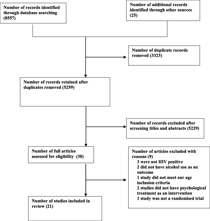 Results: A total of 21 studies (6954 participants) were included in this review. Studies had diverse populations including men alone, men and women and men who had sex with men (MSM). Use of motivational interviewing alone or blended with cognitive behavioural therapy (CBT) and technology/computer-assisted platforms were common as individual-level interventions, while a few studies investigated group motivational interviewing or CBT. Alcohol use outcomes were all self-report and included assessment of the quantity and the frequency of alcohol use. Measured secondary outcomes included viral load, CD4 count or other self-reported outcomes. There was a lack of evidence for significant intervention effects in the included studies. Isolated effects of motivational interviewing, cognitive behavioural therapy and group therapy were noted. However for some of the studies that found significant effects, the effect sizes were small and not sustained over time. Owing to the variation in outcome measures employed across studies, no meta-analysis could be carried out.