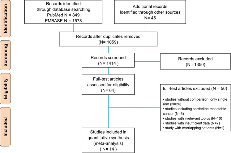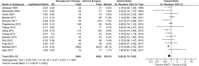The effectiveness of neoadjuvant therapy (NAT) remains unclear in resectable pancreatic cancer (PC) as compared with upfront surgery (US). The aim of this study was to investigate the survival gain of NAT over US in resectable PC. PubMed and EMBASE were searched for studies comparing survival outcomes between NAT and US for resectable PC until June 2018. Overall survival (OS) was analyzed according to treatment strategy (NAT versus US) and analytic methods (intention-to-treat analysis (ITT) and per-protocol analysis (PP)). In 14 studies, 2,699 and 6,992 patients were treated with NAT and US, respectively. Although PP analysis showed the survival gain of NAT (HR 0.72, 95% CI 0.68-0.76), ITT analysis did not show the statistical significance (HR 0.96, 95% CI 0.82-1.12). However, NAT completed with subsequent surgery showed better survival over US completed with adjuvant therapy (HR 0.82, 95% CI 0.71-0.93). In conclusion, the supporting evidence for NAT in resectable PC was insufficient because the benefit was not demonstrated in ITT analysis. However, among the patients who completed both surgery and chemotherapy, NAT showed survival benefit over adjuvant therapy. Therefore, NAT could have a role of triaging the patients for surgery even in resectable PC.