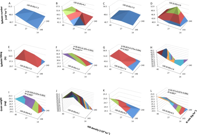 Low light is a common environmental factor that adversely affects rice yields. This study was conducted to evaluate the combined effect of hill density and nitrogen (N) fertilizer rate on yield attributes in hybrid rice under low-light conditions. Field experiments were conducted in 2014 and 2015. Two hybrid rice cultivars (Y-liangyou 1 and Luoyou 9348) were grown under combinations of three hill density levels (high, 40 × 104 hills ha-1; moderate, 27 × 104 hills ha-1; low, 14 × 104 hills ha-1) and two N rate levels (high, 240 kg ha-1; moderate, 143-148 kg ha-1), and shaded from heading to maturity. Grain yield was highest in the combination of high hill density and moderate N rate and significantly declined with decreasing hill density combined with increasing N rate for both cultivars in both years. Averaged across two cultivars and two years, grain yield declined by about 4% for each 10% decrease in hill density combined with each 10% increase in N rate. A significant reduction in spikelet filling percentage was observed with decreasing hill density combined with increasing N rate in Y-liangyou 1 in 2015 and Luoyou 9348 in 2014. The same trend was observed for grain weight in Y-liangyou 1 in 2014 and Luoyou 9348 in 2015. These results indicate that adopting the practice of decreasing hill density combined with increasing N rate can result in poor grain filling and consequently yield decline in hybrid rice under low-light conditions.