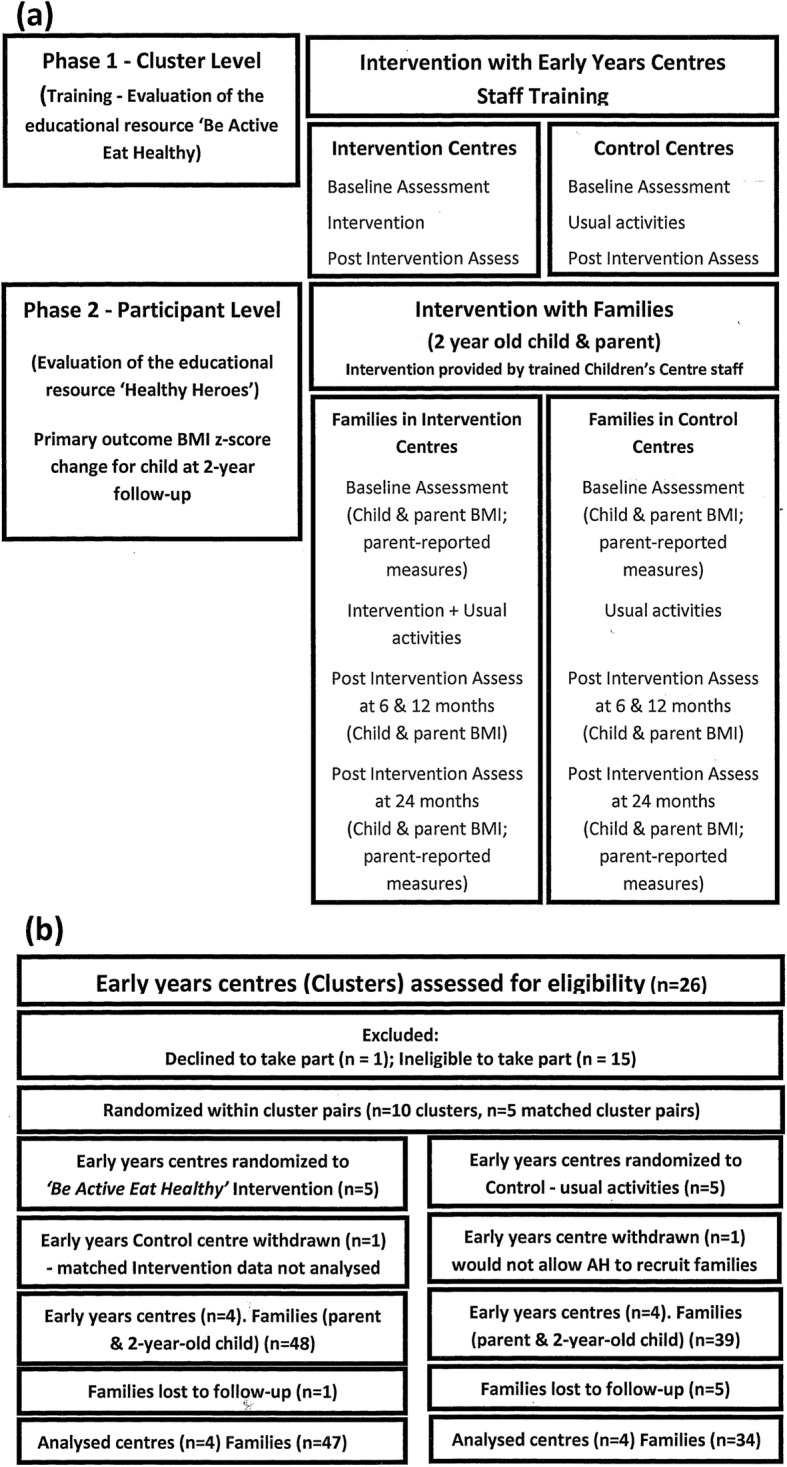 Methods: A pragmatic, cluster randomised trial with a parallel, matched-pair design was undertaken. Interventions were targeted at both the cluster (Early Years' Centres, matched by geographical area) and individual participant level (families: mother and 2-year old child). At the cluster level, a staff training intervention used the educational resource Be Active, Eat Healthy. Policies and provision for healthy eating and physical activity were evaluated at baseline and 12-months. The intervention at participant level was the Healthy Heroes Activity Pack: delivered over 6 months by Centre staff to promote healthy eating and physical activity in a fun, interactive way. Child and parent height and weight were measured at four time-points over 2 years. The trial primary outcome was the change in BMI z-score of the child between ages 2 and 4 years. Secondary outcomes consisted of parent-reported measures administered at baseline and two-year follow-up.