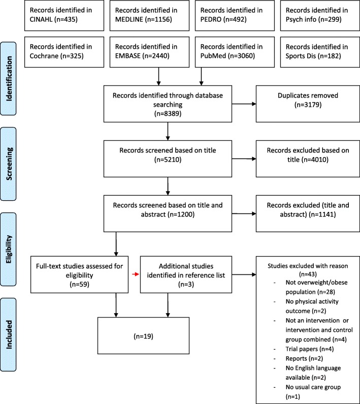 Results: From 8389 studies, 19 met the inclusion criteria 13 of which were suitable for inclusion in a meta-analysis. The remaining 6 studies were described narratively due to insufficient data and different outcome measures reported. In the meta-analysis, comparing interventions to a control group, significant increases were found in the intervention group for metabolic equivalent (SMD 0.39 [0.14, 0.64], Z = 3.08 P = 0.002) and physical fitness (VO2 max) (SMD 0.55 [0.34, 0.75], Z = 5.20 P = < 0.001). Of the other six, five studies reported an increase in PA for the intervention group versus the control with the other study reporting a significant decrease for women in their 3rd trimester (p = 0.002). 'Self-monitoring of behaviour' was the most frequently used BCTs (76.5%), with 'social support' being newly identified for this pregnant population with overweight or obesity.
