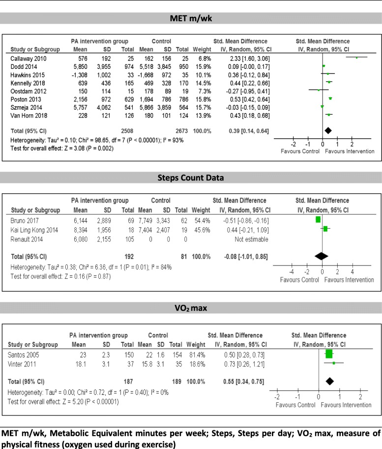 Methods: A systematic review and meta-analysis of PA intervention studies using the PRISMA statement was conducted. Searches were conducted of eight databases in January 2019. Strict inclusion/exclusion criteria were employed. The validity of each included study was assessed using the Cochrane Collaboration's tool for assessing risk of bias. The primary outcome measure was change in PA levels, subjectively or objectively measured, with physical fitness as a secondary outcome. All intervention descriptions were double coded by two authors using Michie's et al's BCT taxonomy V1. Meta-analyses using random effect models assessed the intervention effects on PA. Other PA outcomes were summarised in a narrative synthesis.