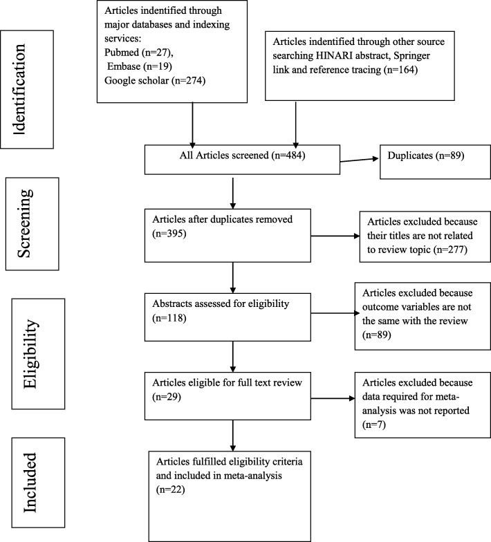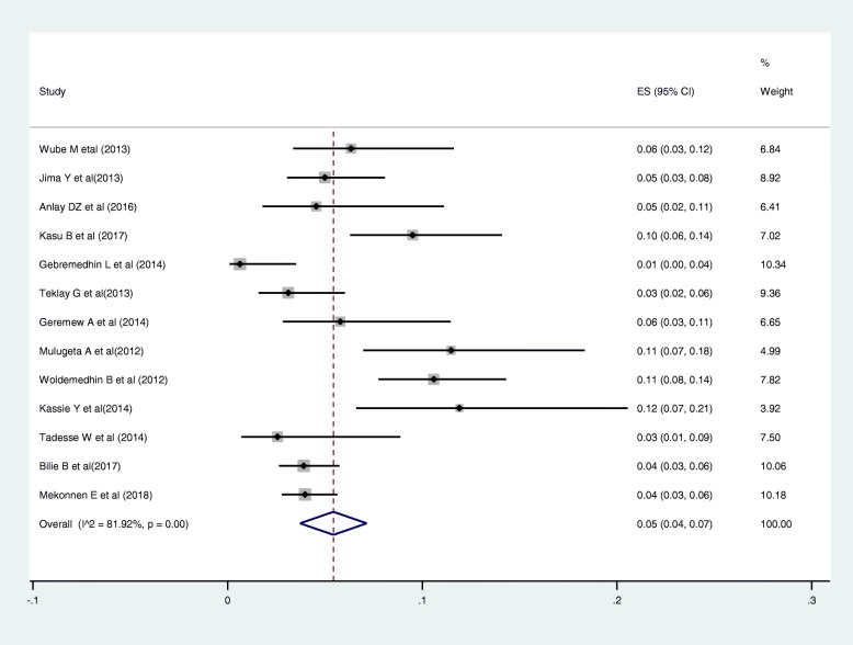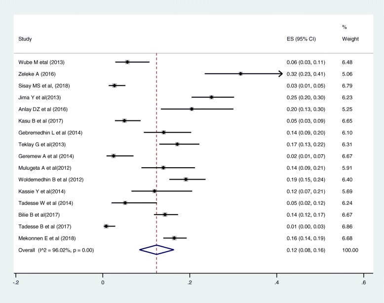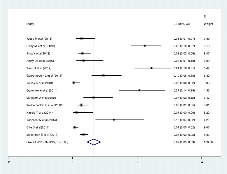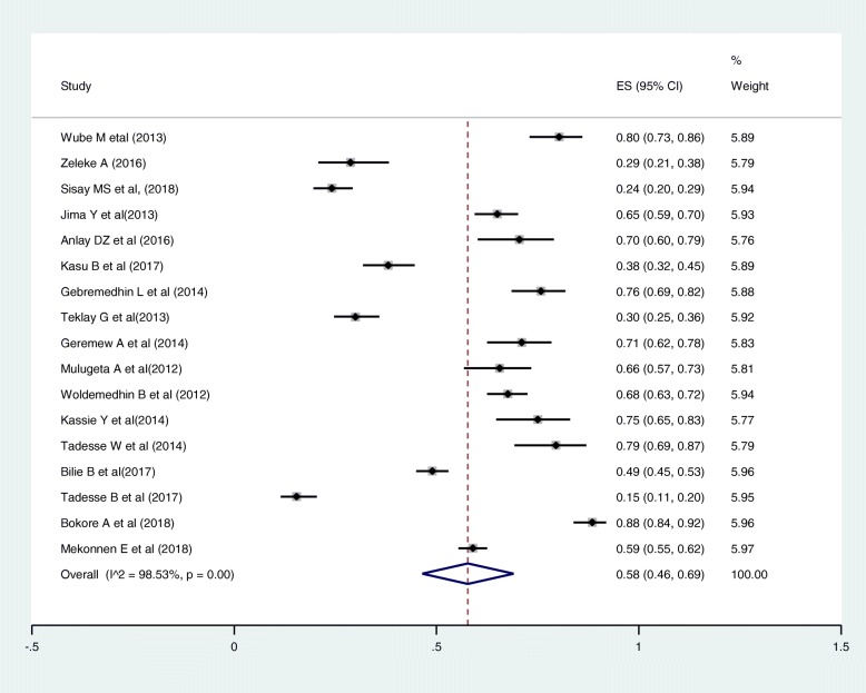 Results: A total of 22 studies published between the years 2012 and 2018 were included. Out of 22 articles, 14 articles reported the magnitude of regimen change and consisted of 13,668 HIV patients. The estimated national pooled magnitude of regimen change was 37% (95% CI: 34, 44%; Range: 15.1-63.8%) with degree of heterogeneity (I2), 98.7%; p-value < 0.001. Seventeen articles were used to identify the causes for first-line antiretroviral therapy regimen change. The major causes identified were toxicity, 58% (95% CI: 46, 69%; Range: 14.4-88.5%); TB co-morbidity, 12% (95% CI: 8, 16%; Range: 0.8-31.7%); treatment failure, 7% (95% CI: 5, 9%; Range: 0.4-24.4%); and pregnancy, 5% (95% CI: 4, 7%; Range: 0.6-11.9%).
